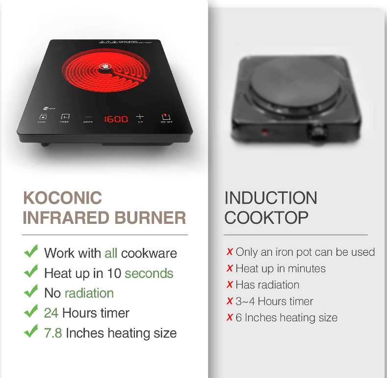 • 【All Cooking Utensils】All kinds of pots and pans can be used on the Electric Burner,such as iron,aluminum,copper,ceramics,stainless steel,As long as the pan is flat and heat-resistant, it can be safely used on the Electric Ceramic Burner!