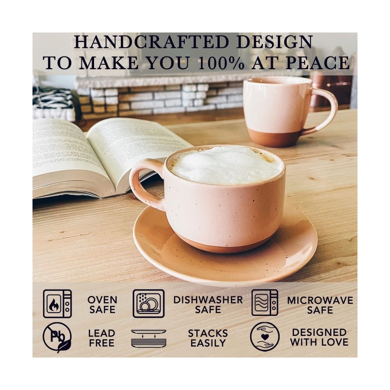 8Oz Cappuccino Mug Set of 4 - Ceramic Coffee Cups with Saucers - Microwave and D