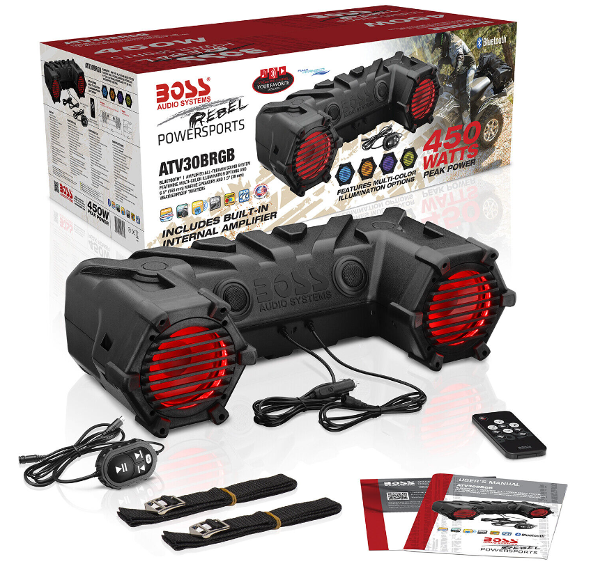 Take your music on the trails, tailgating or camping with the BOSS Audio Systems ATV30BRGB weatherproof powersports plug and play system.