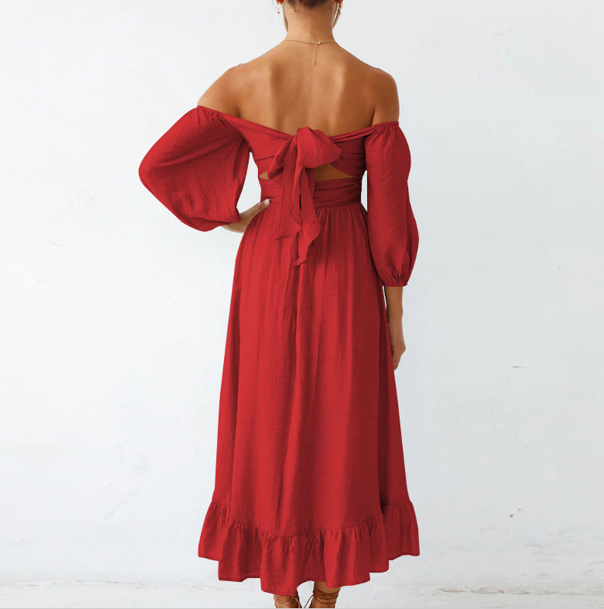(Bright Red L)Dress Half Puff Sleeve Neck Backless Flounce Hem High HG5