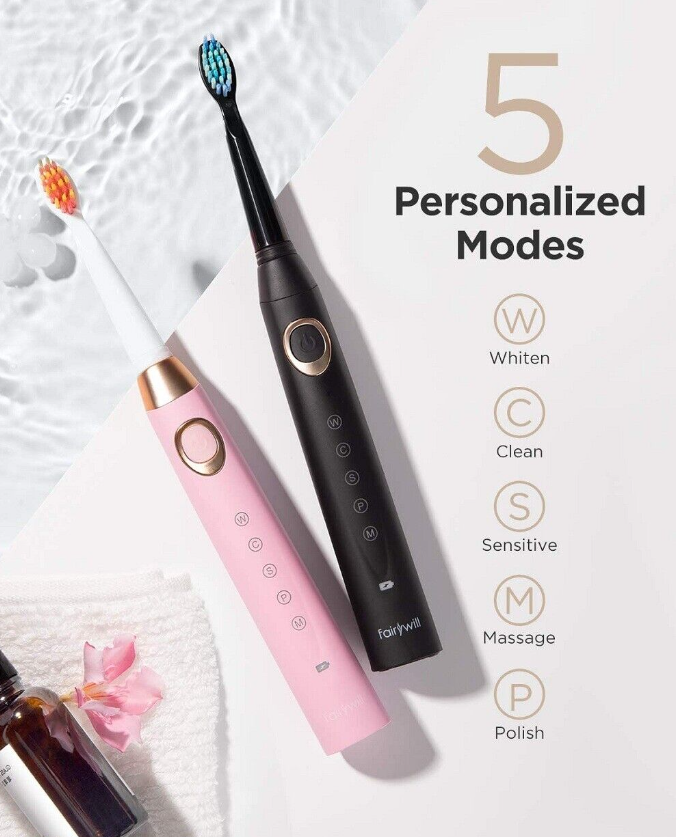 Fairywill Electric Sonic Toothbrush x 2 Rechargeable 2 Min Timer Black & Pink