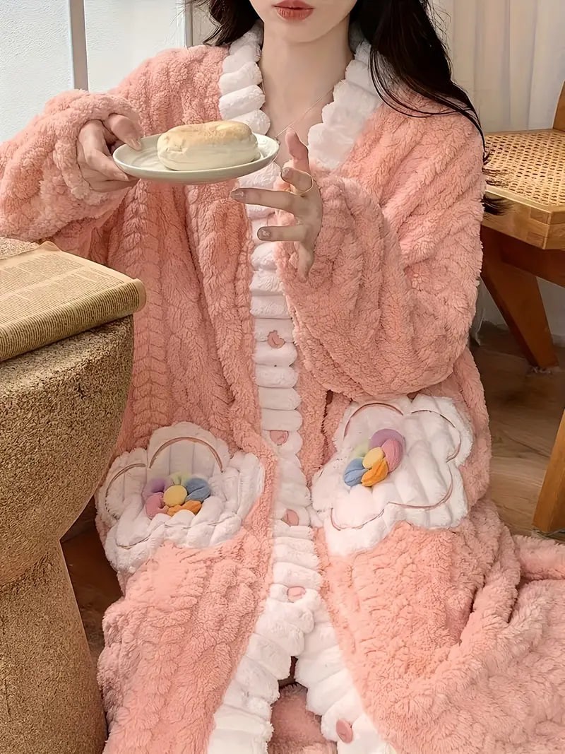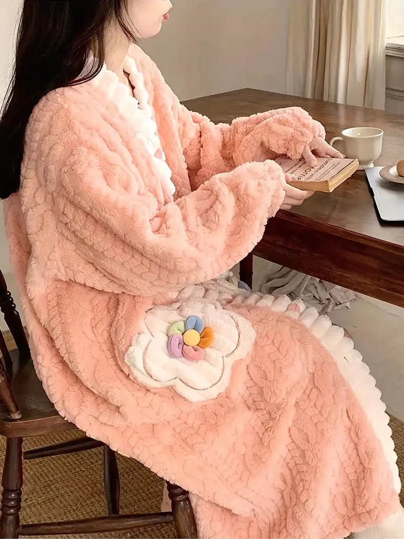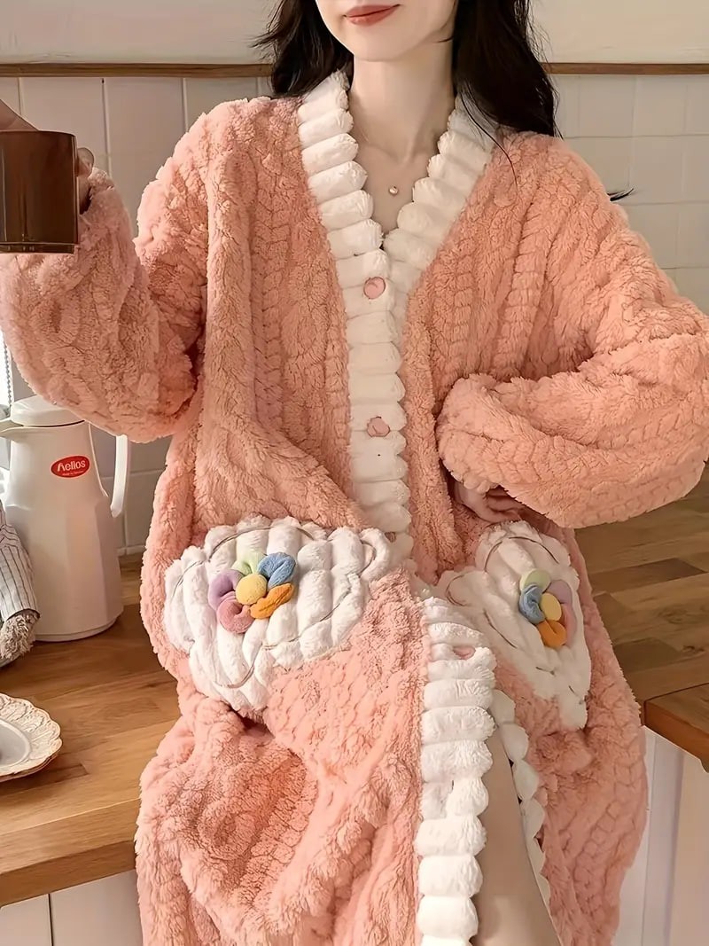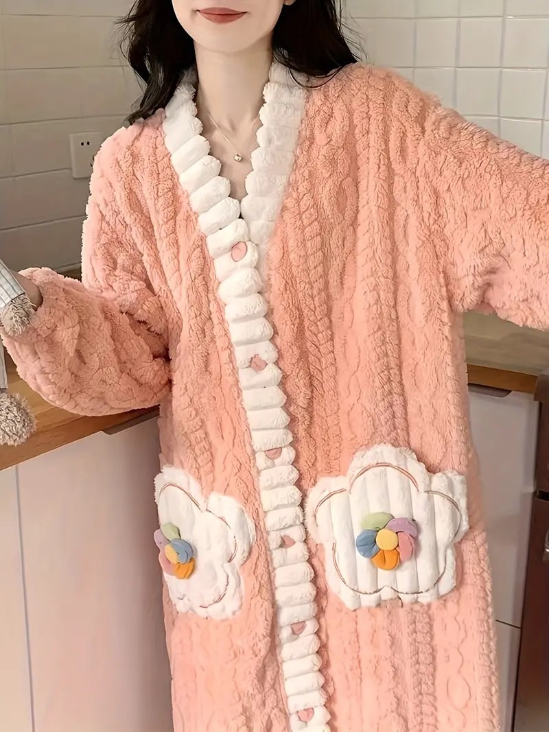 Flower Decor Fuzzy Night Robe, Cute Long Sleeve V Neck Robe With Pockets, Women's Sleepwear