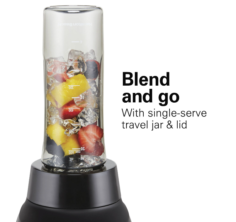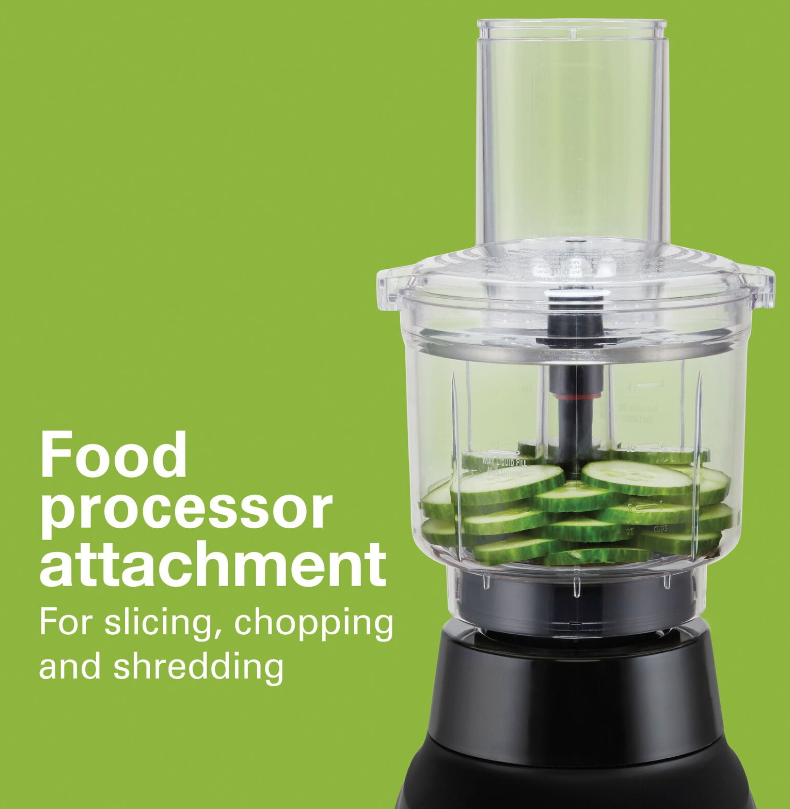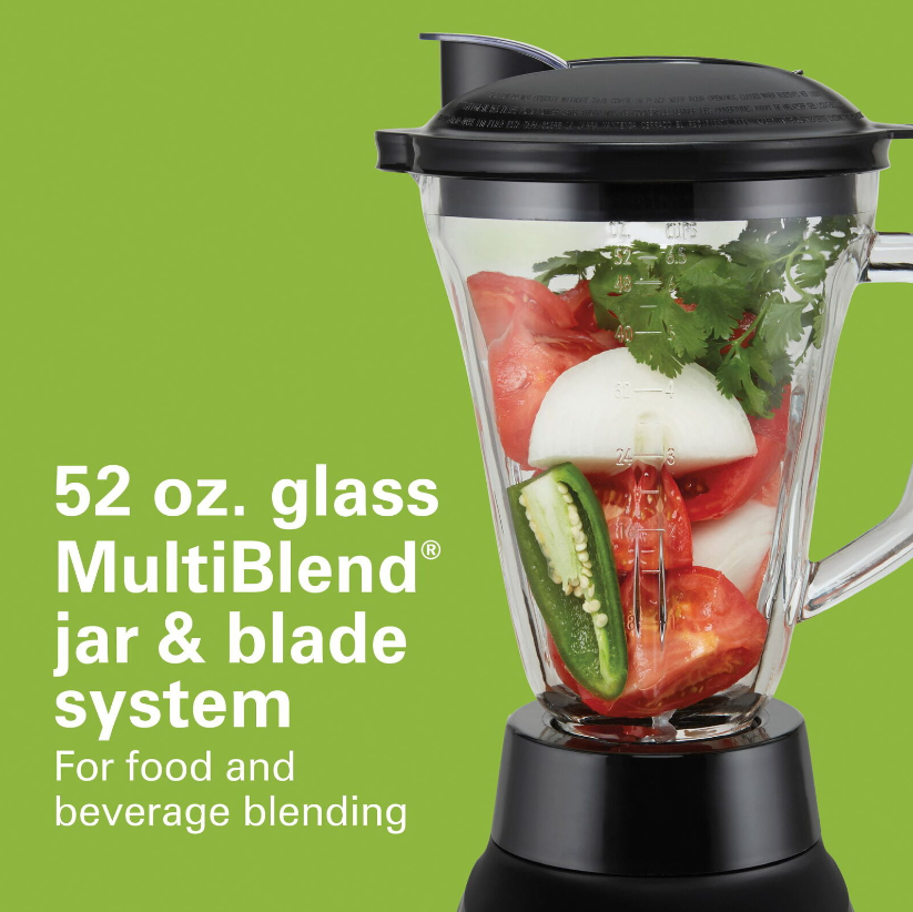 The versatile Hamilton Beach Multi Blend Kitchen System does the work of 3 separate appliances: a traditional kitchen blender, a food processor, and a personal blender. It has a powerful motor with 800 watts of peak power that crushes ice, blends, mixes, chops, slices, shreds and more. A single Multi Blend Blade System handles all your blending and food processing needs. Just choose the right attachment: the 52 oz. glass Multi Blend Jar, the 20 oz. personal jar for single-serve smoothies and shakes, or the food processor attachment with an included slicing and shredding disc. Use the 52 oz. glass blending jar with drip-free pouring spout to make a batch of milkshakes or to puree fresh pasta sauce. Or, swap the jar for the 3-cup food processor attachment to chop vegetables or mince garlic for a stir fry; it includes a chute and food pusher to make adding foods easy. The single-serve 20 oz. travel jar is perfect for morning smoothies when you're in a hurry. It's BPA free and includes a leak-proof lid for drinking on the go. Designed for quieter blending, the Hamilton Beach? Multi Blend Kitchen System is easy to operate, with all the power you need and simple controls. Hamilton Beach Multi Blend Kitchen System, 3-in-1 Blender with Food Processor Attachment, 52 oz. Blending Jar, and 20 oz. Travel Jar, 58176: