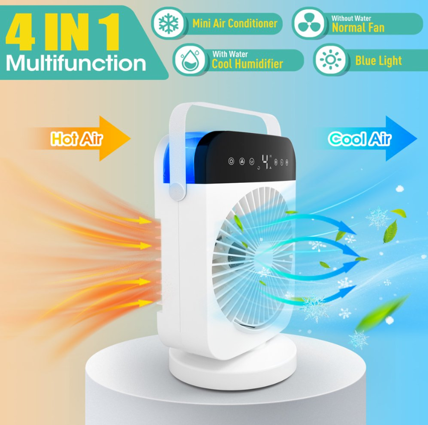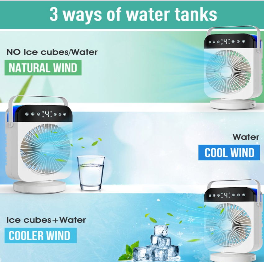 ❄Mini portable air conditioner can save your money and blows cooling wind, keeps your skin moisture and enjoy fresh air, which is very easy and portable to carry & move. It can be multifunctional as a combination of a mini air conditioner, desk fan, misting fan, night light, and humidifier.
