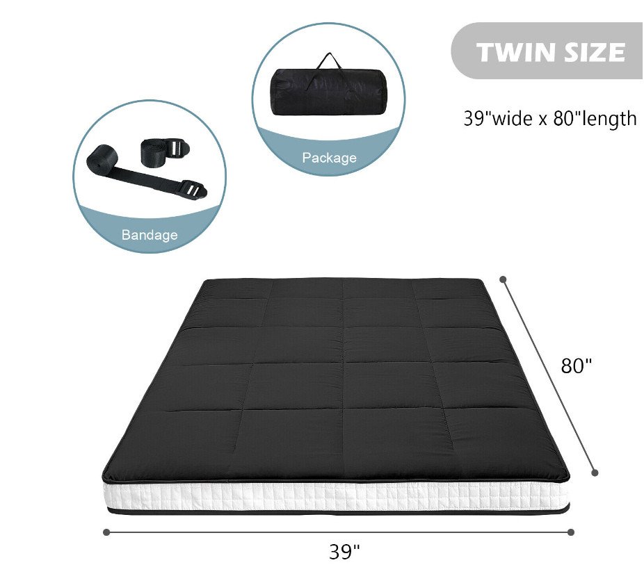 ▶ 【UPGRADED EXCELLENT WORKMANSHIP】:The thickness of the futon mattress before quilting is nearly 17 cm. The top and bottom layer are 6cm thickness polyester filling, the middle layer is 5cm thickness high quality memory foam. We have upgraded the middler layer so that the futon mattress will not collapse easily, memory foam will offer a better support when you lying on the mattress. After the quilting the original thickness of the mattress is about 8-10 cm.