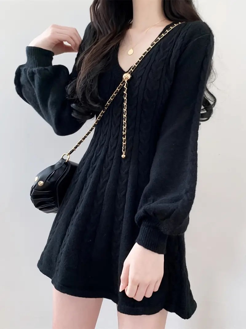 Solid Cable Knit Dress, Elegant V Neck Lantern Long Sleeve Dress, Women's Clothing